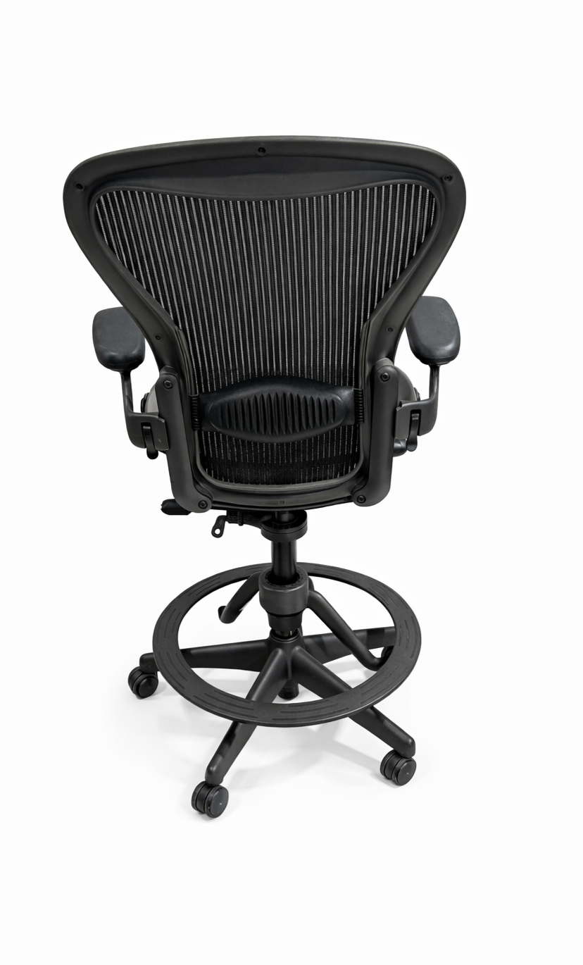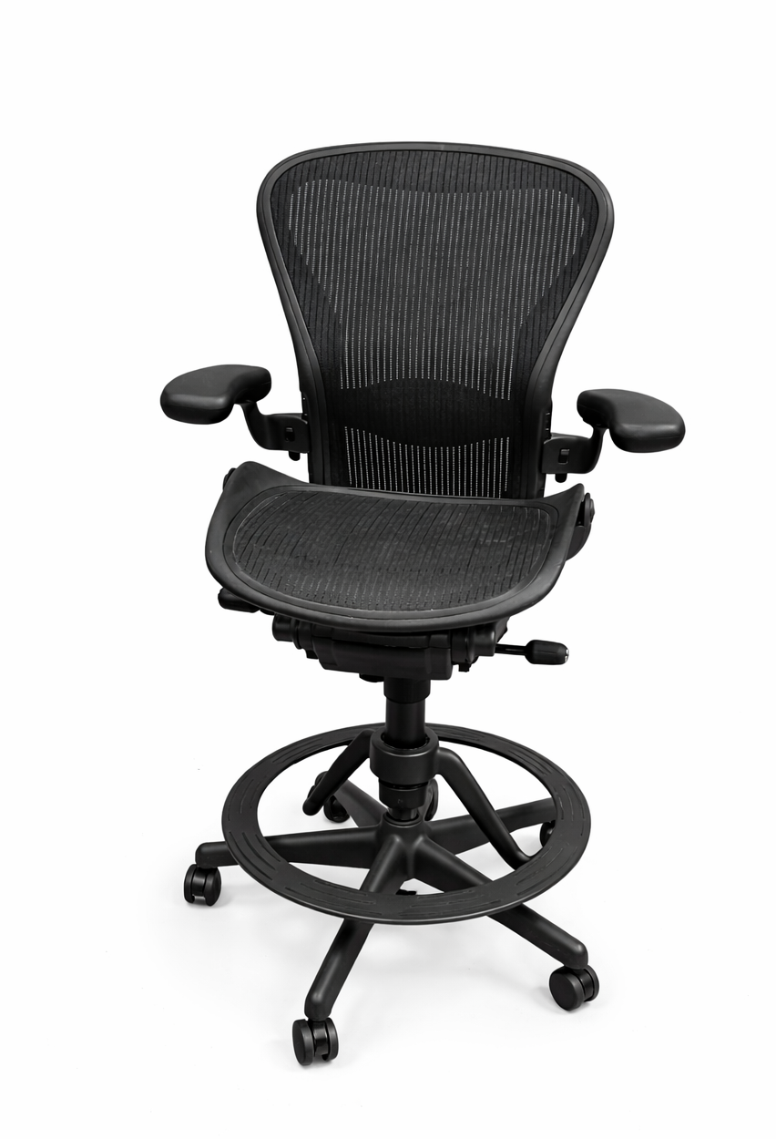 Upgrade your workspace with the Herman Miller Aeron Drafting Chair, a high-performance ergonomic chair designed for comfort and durability. Featuring the iconic Aeron mesh seat and backrest for breathable support, this drafting model adds a sturdy foot ring and adjustable height mechanism—perfect for standing desks, drafting tables, studios, or collaborative work areas.